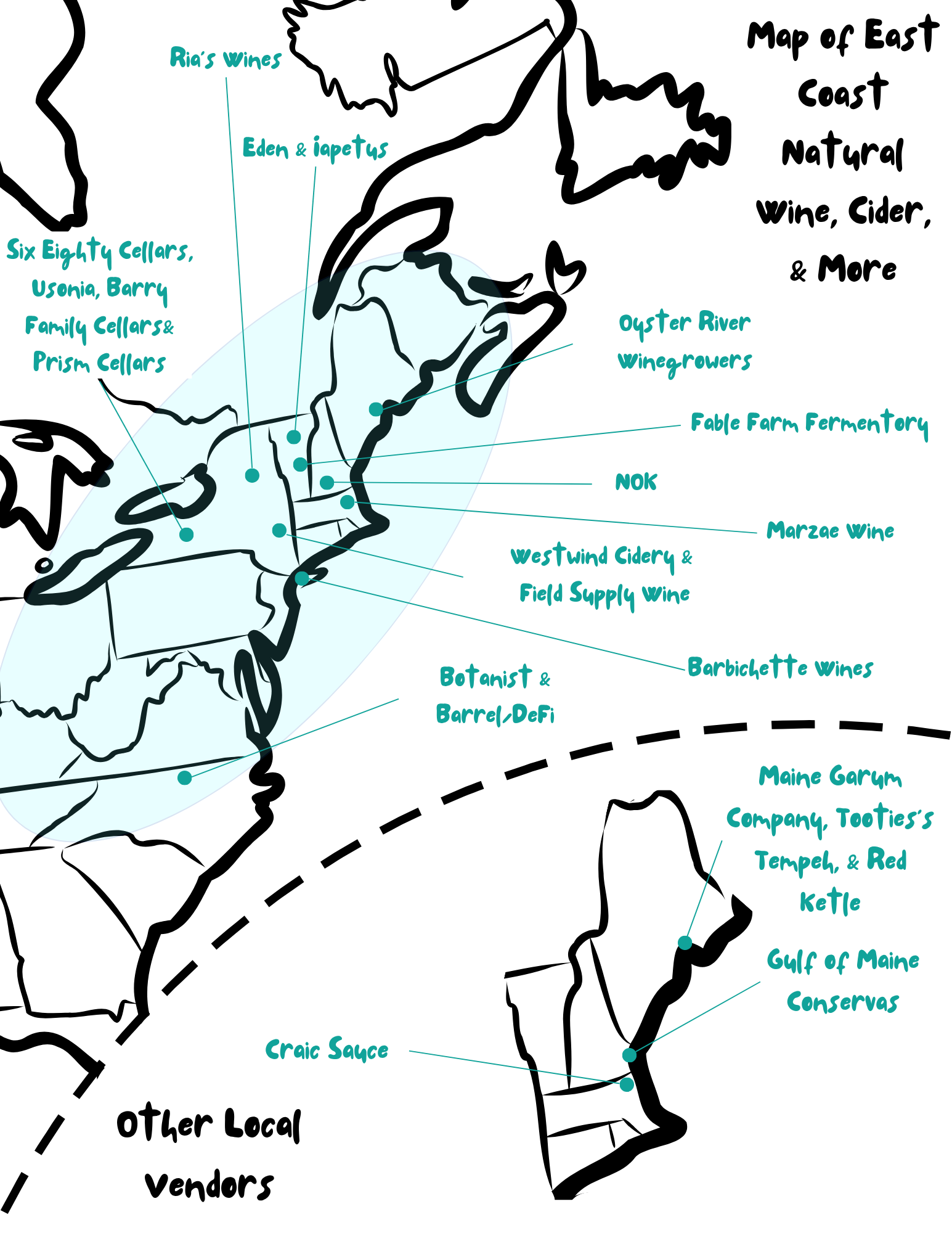 Marzae Wine (MA), Field Supply Wine (NY), Barbichette Wines* (NY), Fable Farm Fermentory (VT), Botanist & Barrel/DeFi Wines* (NC), Westwind Orchard (NY), Usonia* (NY), Six Eighty Cellars (NY), Prism Cellars* (NY), Oyster River Winegrowers* (ME, tentitive), NOK (NH), Iapetus/Eden (VT), Ria’s Wines* (NY), Barry Family Cellars* (NY)